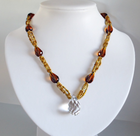 This crystal drop pendant necklace is a simple and distinctive accessory that easily complements any formal, professional ensemble. It features cognac coloured drop crystal beads beautifully accentuated by tiny gold-coloured glass beads with a large, 0.75″ clear crystal drop pendant.