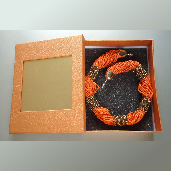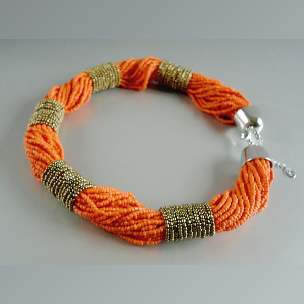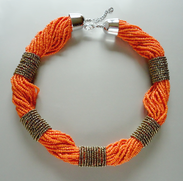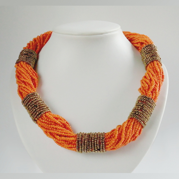The Orange Dame is a flamboyant twist necklace that's sure to turn heads. Intricate brass accents highlight its round silhouette perfectly. Wear this necklace with your African print dress to take your semi-formal style up a notch. Better yet, plan your festive traditional ensemble around it for a stunning look.